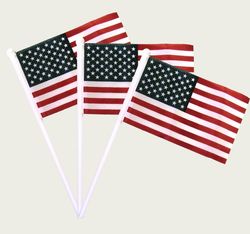 A very attractive USA hand held flag with sewn sleeve on attractive white pole, blank pole. Made from 100% superior polyester fabric, bright attractive vivid colors. Flag measures 4" x 6". Comes with attractive white plastic pole. Pole measures approximately 12". Polyester flags are superior in quality to cotton flags . They look nicer, fly better and last longer. Our sewn sleeves are superior and much nicer than the cheaper stapled flags that fall apart easily.