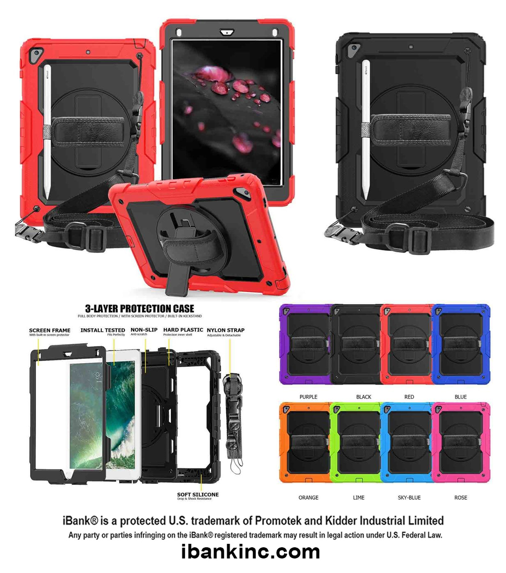 Adjustable length shoulder strap. The stand can provide multi -angle support. The shoulder strap can hang your tablet somewhere.
